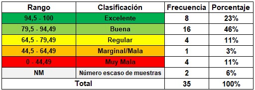 La clasificación se basa en 5 clases, de excelente a muy mala, y representa las condiciones del curso de agua relacionada al deterioro que presenta considerando su alejamiento del Uso IV. Es decir, una calidad excelente significa que la calidad del agua está protegida, sin apenas deterioro y la condición del recurso es casi igual a la del estado deseado de Uso IV.
