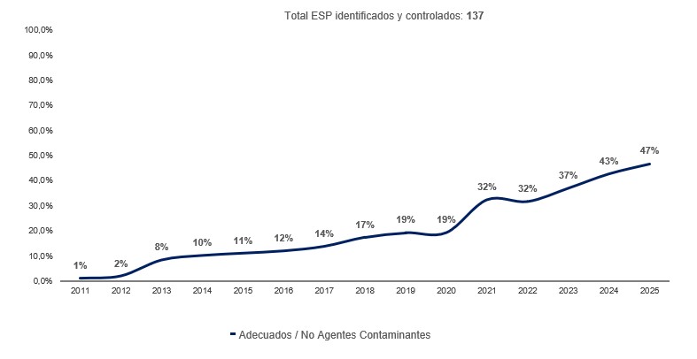 La tendencia histórica del indicador es positiva, alcanzando actualmente un 47% acumulado de establecimientos ambientalmente adecuados sobre el total (137).