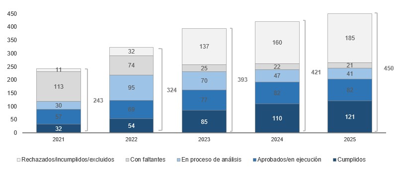Al término del tercer trimestre de 2025, la cantidad acumulada de PA presentados fue de 450. De los cuales a) 121 (26,9%) fueron cumplidos; b) 185 (41,1%) han sido rechazados, incumplidos o excluidos; c) 82 (57%) se encuentran aprobados; y d) 62 (43%) se hallan sin aprobación (c y d, del total de 144 PA vigentes).