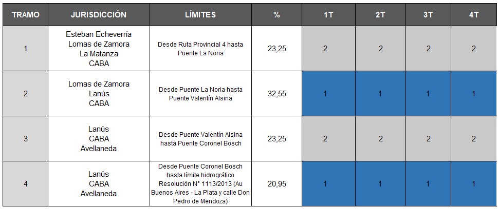 El presente indicador tiene el objetivo de expresar los resultados del mantenimiento del espejo del cauce principal del río Matanza Riachuelo, teniendo en cuenta cuatro tramos. Dichos tramos involucran a los municipios bonaerenses de Avellaneda, Esteban Echeverría, La Matanza, Lanús y Lomas de Zamora, además de la Ciudad Autónoma de Buenos Aires.