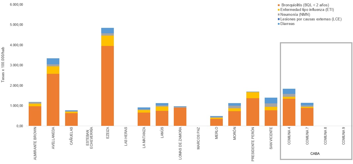 En la población de menores de 5 años, el evento más frecuente de este grupo fue ETI, con 532 casos cada 100.000 habitantes. Presidente Perón y Ezeiza registraron las tasas de notificación más altas, con 2.377 y 2.185 casos cada 100.000 habitantes, respectivamente (n= 292 y n= 488).