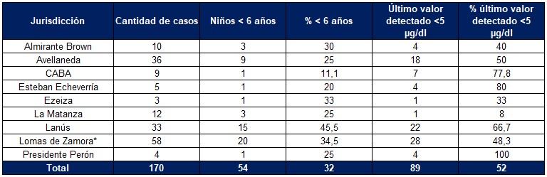 Al analizar las notificaciones de intoxicación/exposición a plomo en las jurisdicciones que conforman la Cuenca para el primer semestre de 2025, la tasa de notificación es de 3,07 cada 100.000 habitantes (n=79). La tasa de notificación más alta fue en el municipio de Lomas de Zamora (6,13 cada 100.000 habitantes)